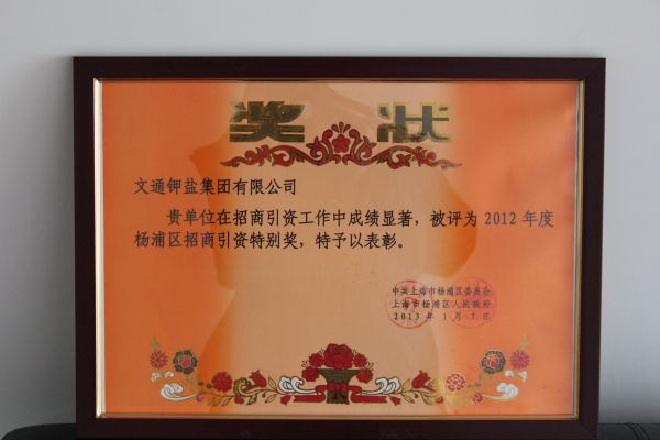 日期:2011/09/07 楊浦區(qū)服務經(jīng)濟、促進發(fā)展大會于2013年1月7日上午在區(qū)政府大樓四樓報告廳召開,文通鉀鹽集團有限公司因在招商引資工作中成績顯著,被評為2012年度楊浦區(qū)招商引資特別獎。集團公司作為中國無機鹽工業(yè)協(xié)會鉀鹽(肥)行業(yè)分會的會長單位,李剛董事長既是鉀鹽行業(yè)協(xié)會的會長,也是上海晉商會名譽會長,在鉀鹽行業(yè)和晉商中有廣泛的人脈優(yōu)勢,集團自2009年落戶上海楊浦以來,已推薦二十余家晉商企業(yè)從山西落戶上海楊浦區(qū)。