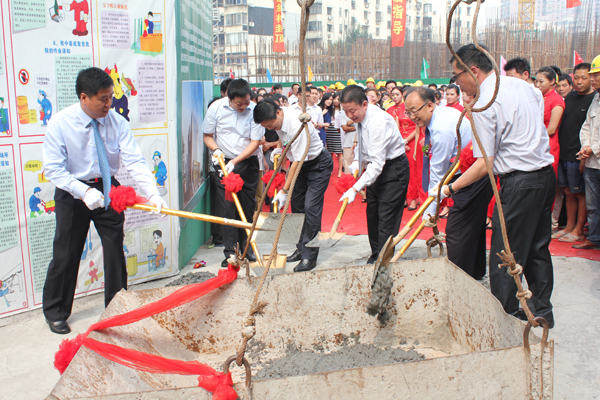 隨后,領(lǐng)導(dǎo)及貴賓為本次封頂儀式剪彩并宣布:“文通大廈正式封頂”。伴隨著剪彩儀式的落幕,舞臺四周冷焰火紛紛燃起,領(lǐng)導(dǎo)們來到灌漿封頂?shù)醵诽?,揮動金鍬將沙漿鏟入封頂?shù)醵罚鯔C隨即緩緩將封頂?shù)醵返踔粒↘4—06地塊辦公樓)頂層進行結(jié)構(gòu)封頂。與此同時,舞臺兩邊噴射出絢爛禮花,五彩繽紛的彩條紙片從天而降,88000響電光炮聲響徹云霄、1800發(fā)開門紅連珠彈直沖天際。全場來賓掌聲雷動。整個會場一片沸騰,現(xiàn)場氣氛達到高潮。