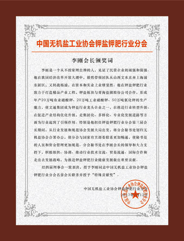 2017年7月12日至14日,中國無機(jī)鹽工業(yè)協(xié)會(huì)鉀鹽鉀肥行業(yè)分會(huì)第四次會(huì)員大會(huì)暨2017鉀鹽鉀肥產(chǎn)業(yè)技術(shù)交流大會(huì)山東省青島市青島花園大酒店召開。會(huì)上,為表示對(duì)李剛會(huì)長在推進(jìn)鉀鹽鉀肥行業(yè)健康發(fā)展以及李剛會(huì)長擔(dān)任鉀鹽鉀肥行業(yè)分會(huì)第三屆會(huì)長期間所做出重要貢獻(xiàn)的肯定與褒獎(jiǎng),經(jīng)中國無機(jī)鹽工業(yè)協(xié)會(huì)鉀鹽鉀肥行業(yè)分會(huì)第四屆理事會(huì)一致表決,授予李剛會(huì)長中國無機(jī)鹽工業(yè)協(xié)會(huì)鉀鹽鉀肥行業(yè)分會(huì)名譽(yù)會(huì)長職務(wù)并授予“特殊貢獻(xiàn)獎(jiǎng)”。
