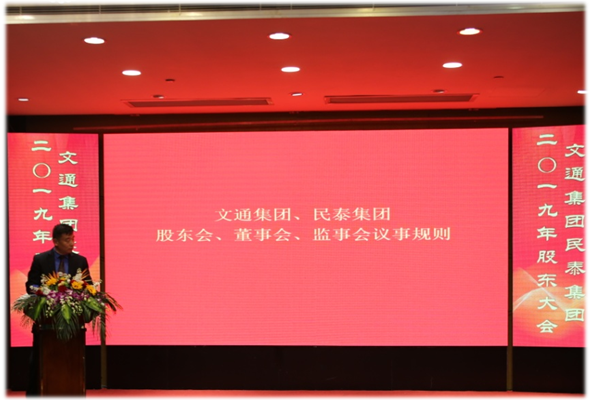 2019年4月12日下午一點三十分,文通鉀鹽集團有限公司(以下簡稱“文通集團”)、上海民泰投資(集團)有限公司(以下簡稱“民泰集團”)2019年股東大會在上海市楊浦區(qū)周家嘴路1888號瀚海明玉三樓華夏會議廳隆重召開。文通集團及民泰集團的股東、董事、監(jiān)事和高級管理人員出席了本次大會,會議由集團總裁李恬然主持。